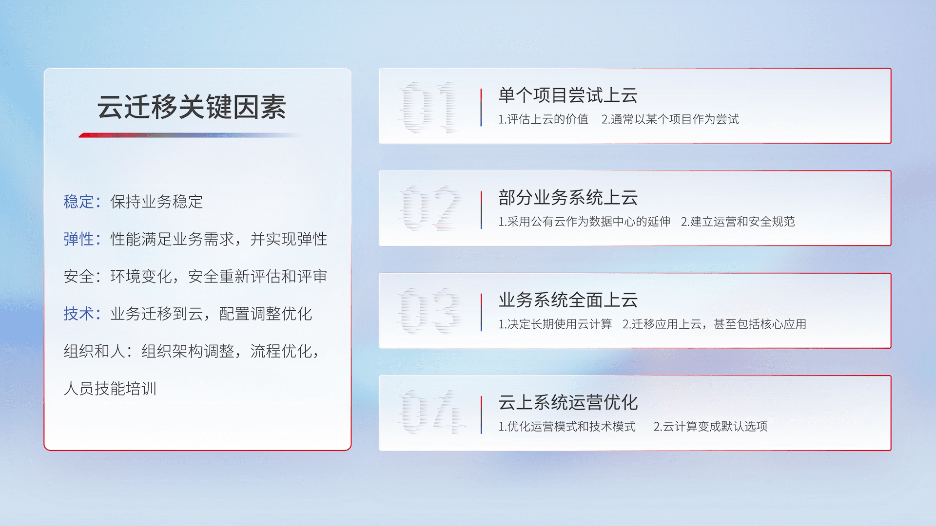 结合实际业务,,,从规划设计、、、、云平台选型、、云原生改造、、数据迁移、、、集成交付,,迁移全过程为客户识别最佳上云路径,,做好风险识别管理,,设计网络架构、、、身份权限、、安全审计合规、、、操作审计、、、、日志审计、、、监控告警策略、、、多站点容灾设计等,,对云上基础设施进行整体规划,,提升IT治理水平,,,,以满足弹性、、、高可用、、高性能的需求。。
