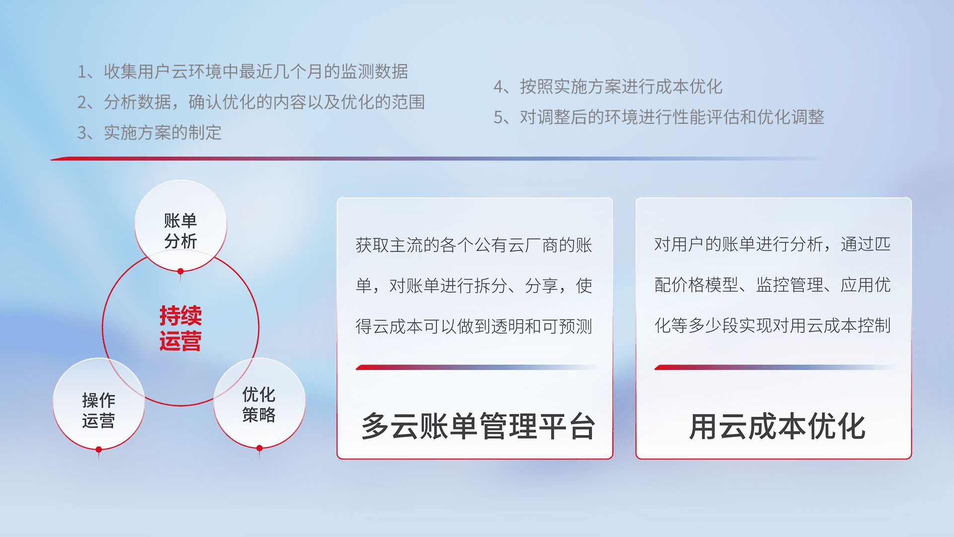 通过多云纳管,,,以统一的资源数据模型把客户的云资源进行抽象和封装,,,,进而实现对多云资源的统一操作,,保障云资源管理的可靠性、、、稳定性与可用性。。。。量身定制化运维内容,,,,配置、、、开发运维、、、、补丁管理、、、备份、、、、监控、、、认证和访问管理、、、审计和日常巡检等,,,,保障在用云过程中的可靠度,,,,稳定度以及高可用率。。。。