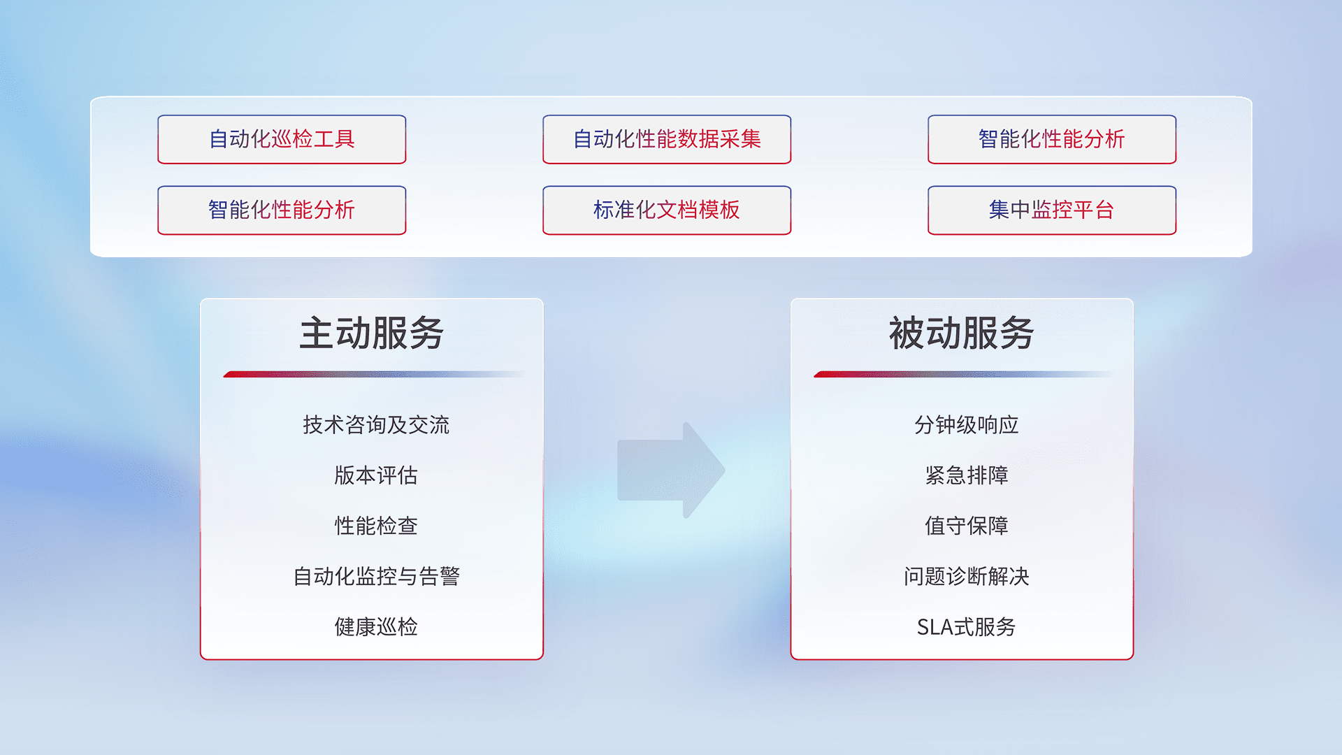 智能化工具和标准化文档,,保障服务质量,,,,提供主动服务(包含技术咨询、、、、版本评估、、、、性能检查、、、、自动化监控与告警、、健康巡检)和被动服务包含(分钟级响应、、紧急排障、、值守保障、、问题诊断解决、、、、SLA服务)。。